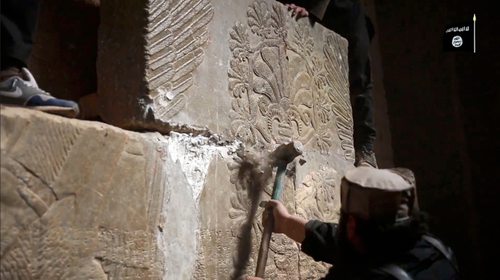 Painéis de baixo-relevo atacados com marretas, perfurados com berbequins e atirados ao chão, onde se estilhaçam enquanto se ouvem em fundo gritos de “Allahu akbar” ("Allah é grande"). Bulldozers investindo sobre paredes que, depois, serão pulverizadas em gigantescas explosões filmadas à distância. Um som tonitruante, uma nuvem de fumo que se ergue e destroços caindo de novo no solo, vários segundos depois da detonação, tal é a força da explosão.