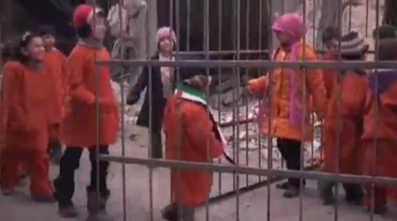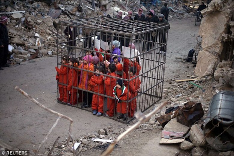 Um grupo de ativistas divulgou imagens que mostram crianças sírias, muitas delas de apenas três anos, trancadas em uma gaiola, em Douma, próximo a Damasco, capital da Síria